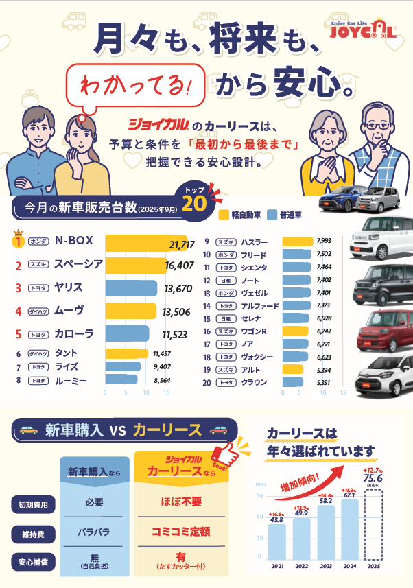 契約の形態が違うだけで、月々お支払いいただくことでは変わりありません。 オートローンと違い、将来発生する車検代金や、税金、メンテナンス費用なども含んだ上で均等にお支払いができるので、生活設計がしやすいです。 |
